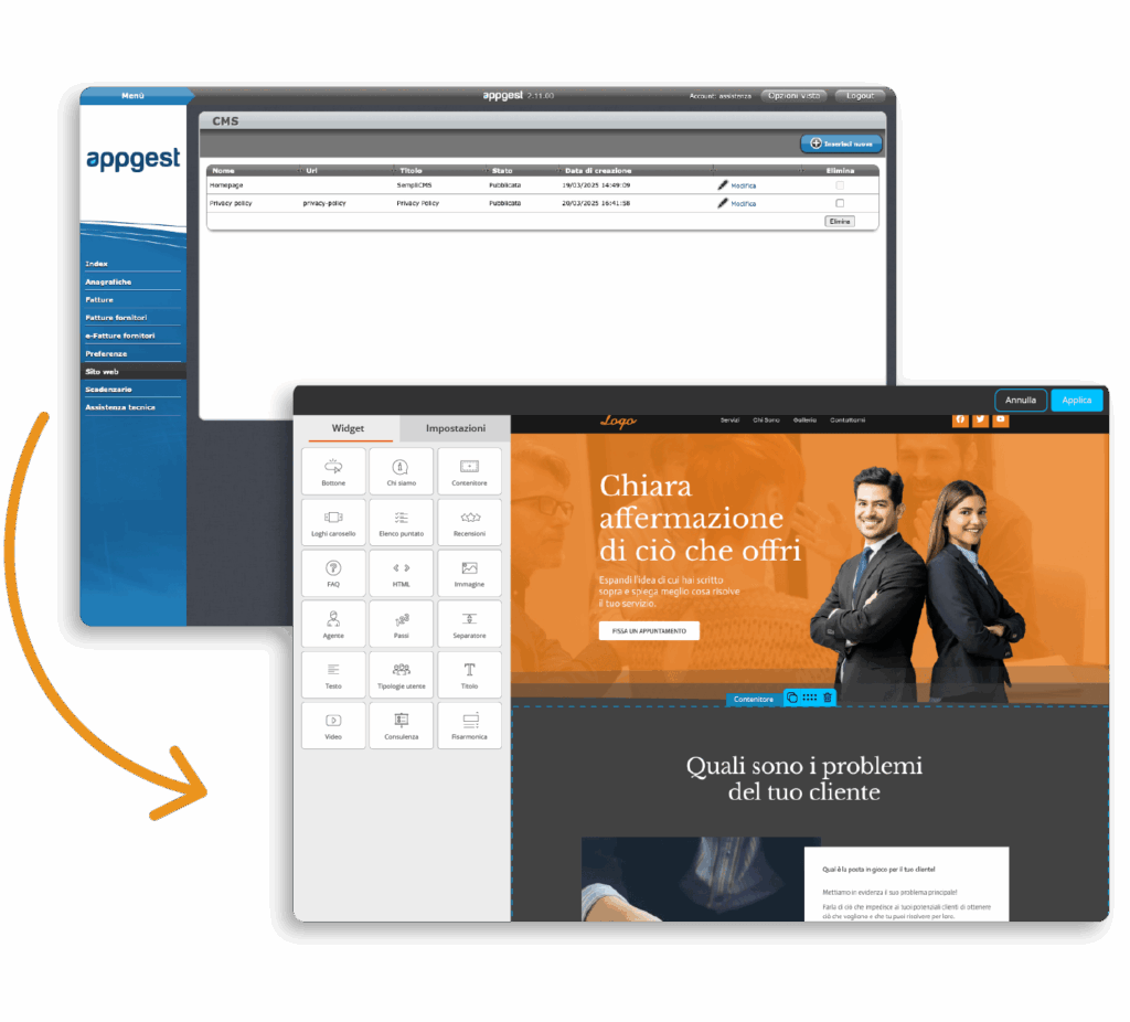 Sì. Il sito è integrato in AppGest (il nostro gestionale in cloud) e include un modulo per il sito web con un editor semplice e intuitivo, che ti permette di modificare testi e immagini in autonomia, senza bisogno di competenze tecniche o costi aggiuntivi.