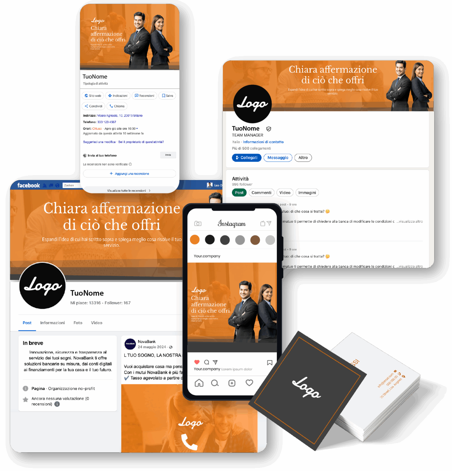 Comunica con testi e grafiche coerenti, adeguati al tuo stile professionale. Rafforza la tua immagine e diventa più riconoscibile agli occhi dei potenziali utenti.