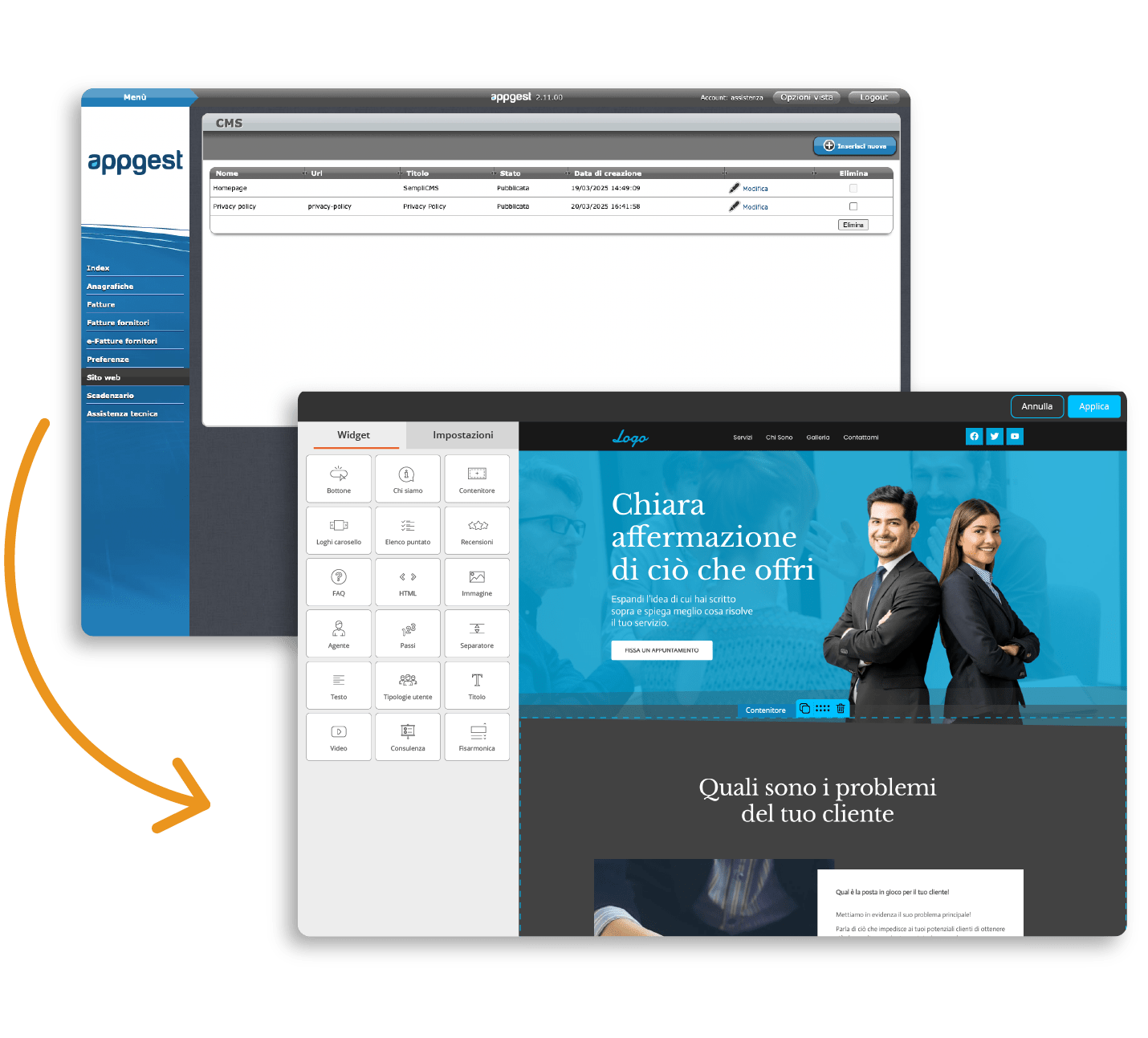 Sì. Il sito è integrato in AppGest (il nostro gestionale in cloud) e include un modulo per il sito web con un editor semplice e intuitivo, che ti permette di modificare testi e immagini in autonomia, senza bisogno di competenze tecniche o costi aggiuntivi.