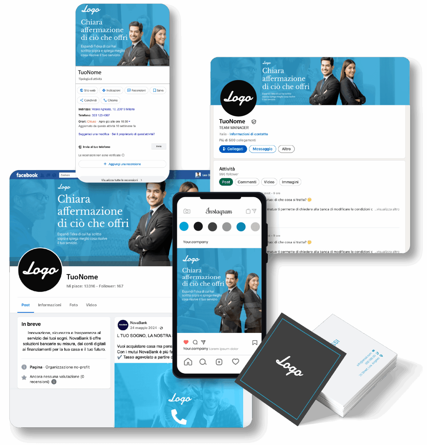 Il nostro intervento riguarda la configurazione iniziale: creiamo i tuoi profili social oppure, se già esistono, li ottimizziamo per renderli armonici con la tua nuova immagine. Prepariamo testi e grafiche coordinati e pubblichiamo 3 post di avvio per ogni canale. Il servizio non comprende la gestione continuativa dei social, ma ti lasciamo profili già pronti e coerenti, così chi ti cerca su quel canale trova subito un’immagine professionale e credibile. Se sei interessato a un’attività costante, possiamo elaborare un’offerta dedicata in base alla frequenza di pubblicazione desiderata.